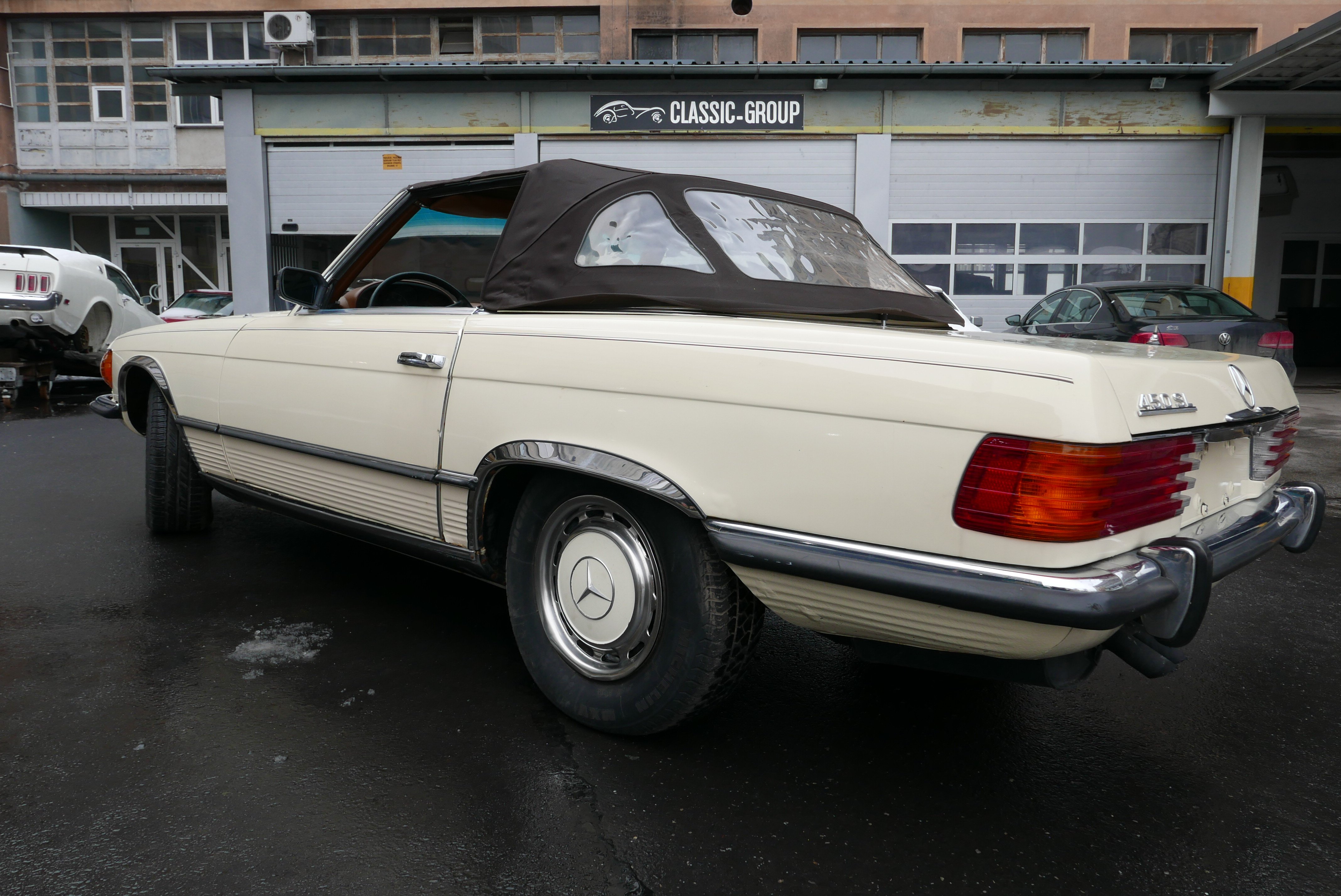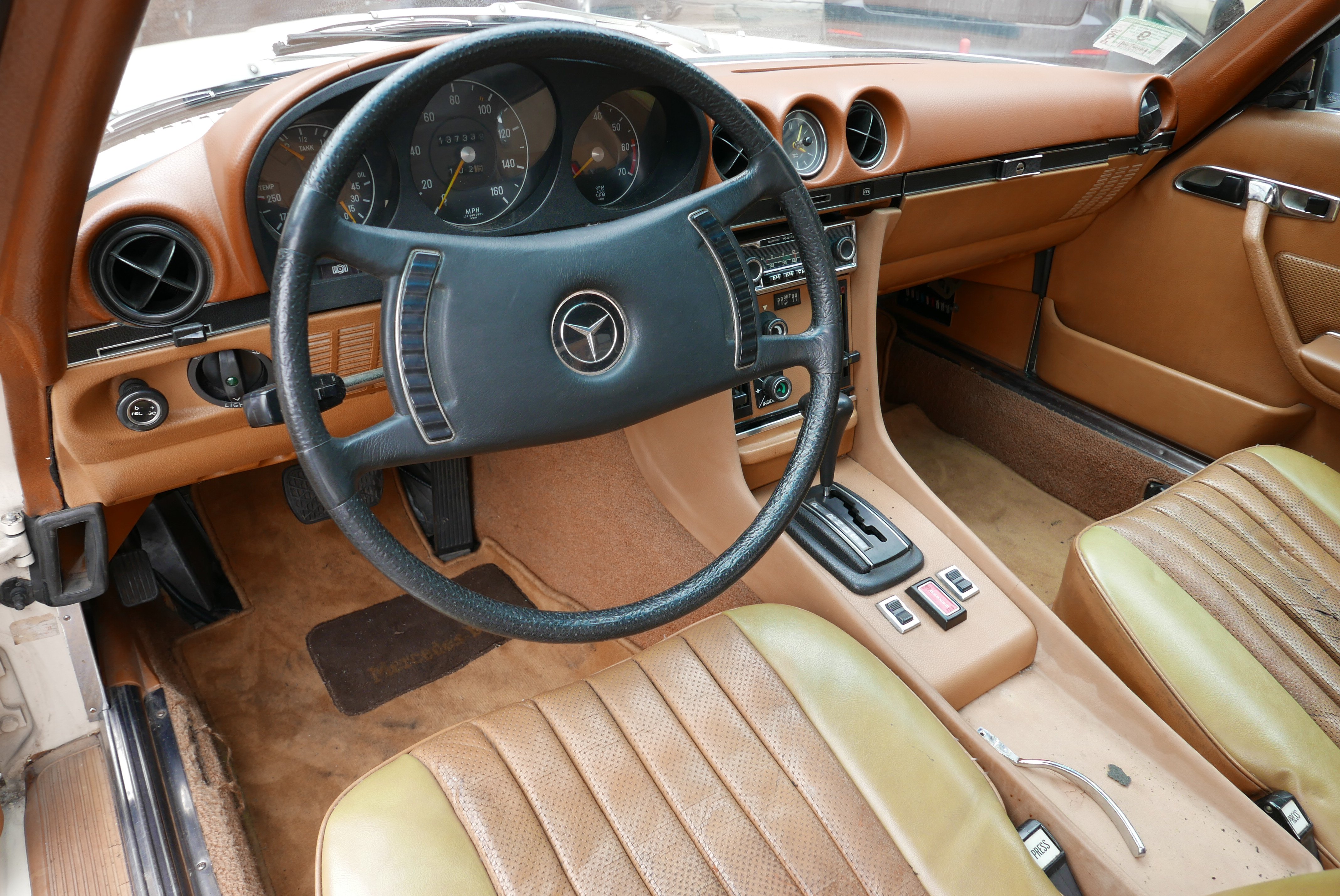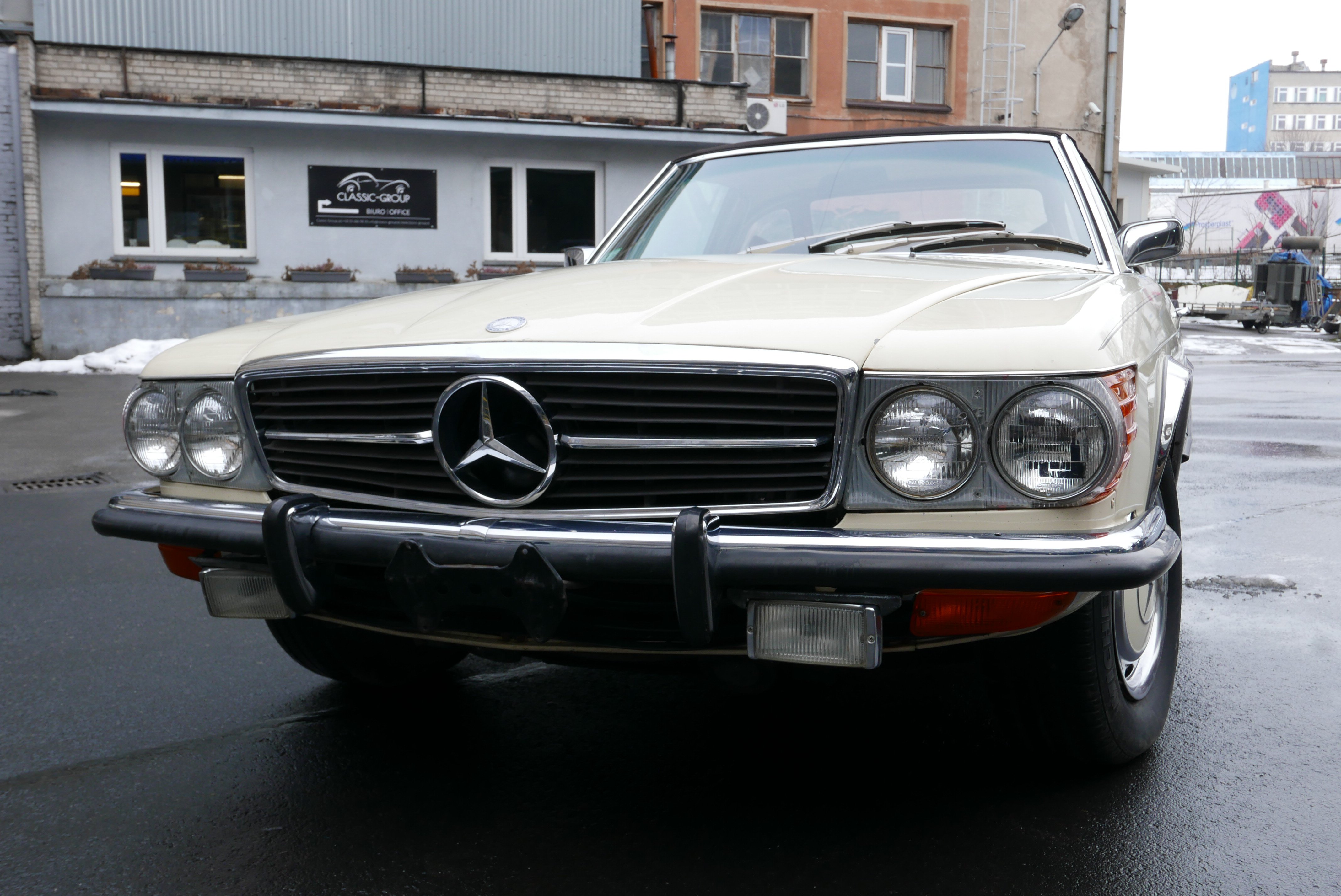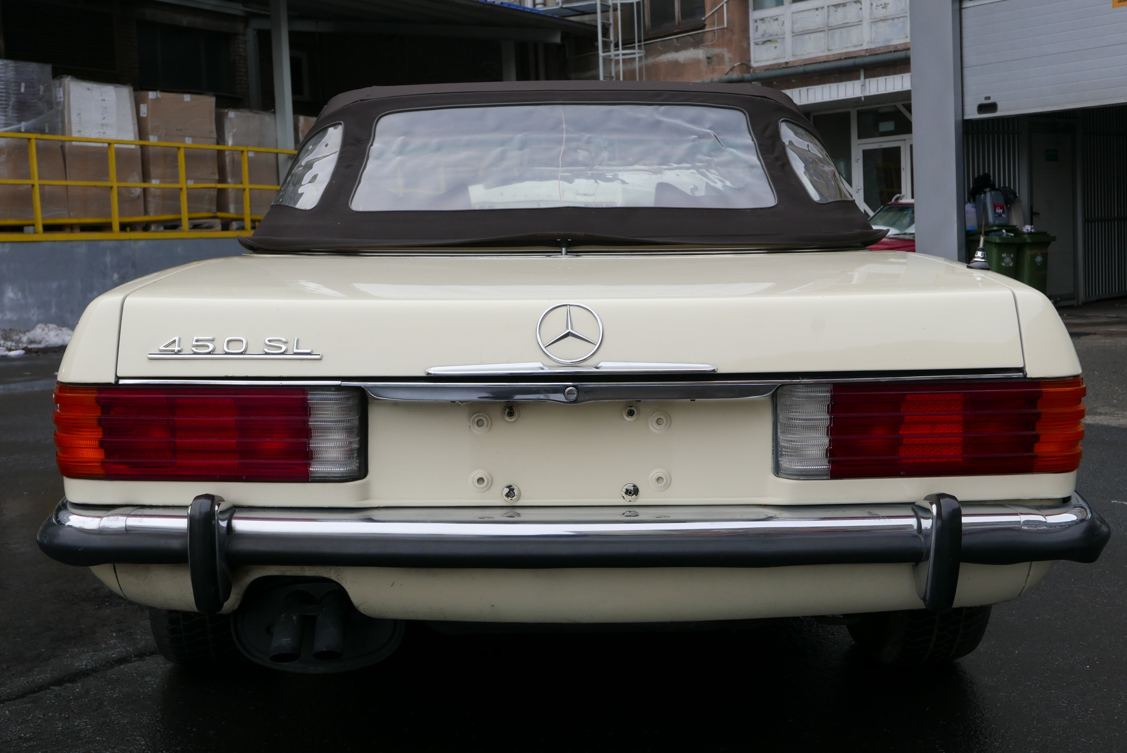 Model, který nabízíme, je Mercedes R107 450SL z první výrobní série a první rok, kdy byl 4,5litrový motor označen podle objemu, dříve to bylo 350 SL a objem byl 4,5 litru. Vůz má evropské nárazníky - na v té době ještě nebyly žádné nárazníky. USA vstoupilo až v roce 1974).