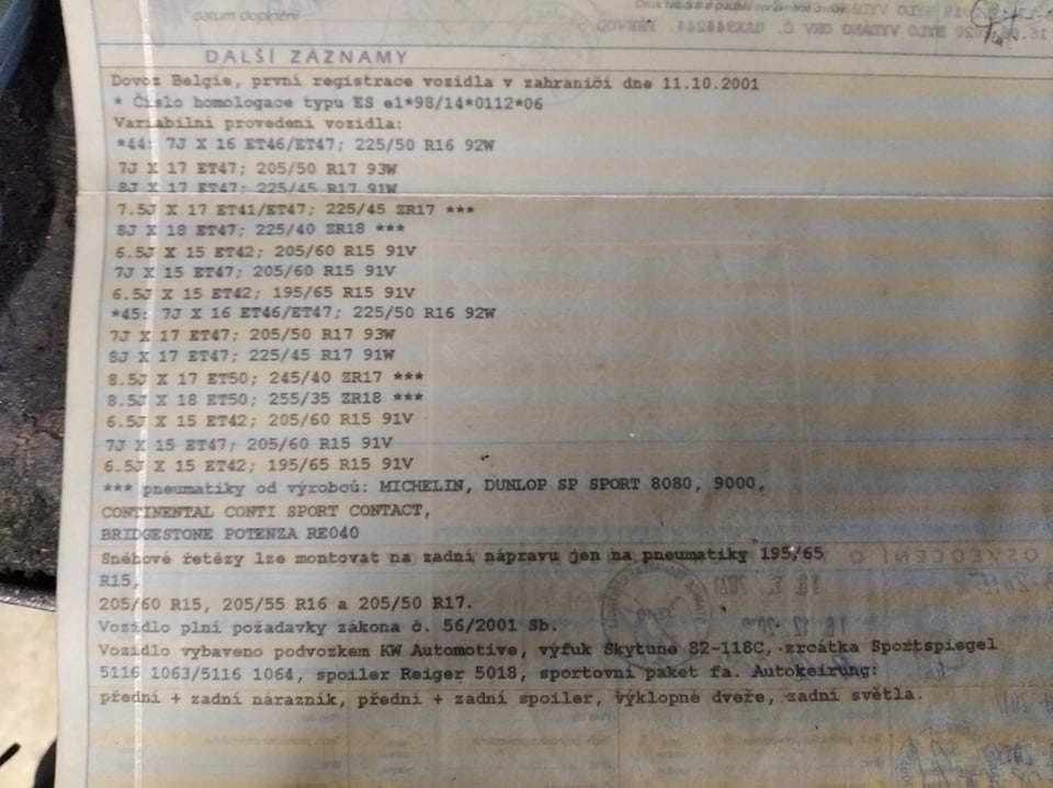 - Nová hardy spojka, spojka, výměněn diferenciál, M3 nárazník s lipem, M3 blatníky, lehce ťuknutý levý blatník, podložky jak u předních tak zadních kol, vyměněny všechny cívky a svíčky, nové čidlo otáček, čidla na přední straně bloku jsou nově přetěsněná. Velká výhoda, auto není nikde shnilé.