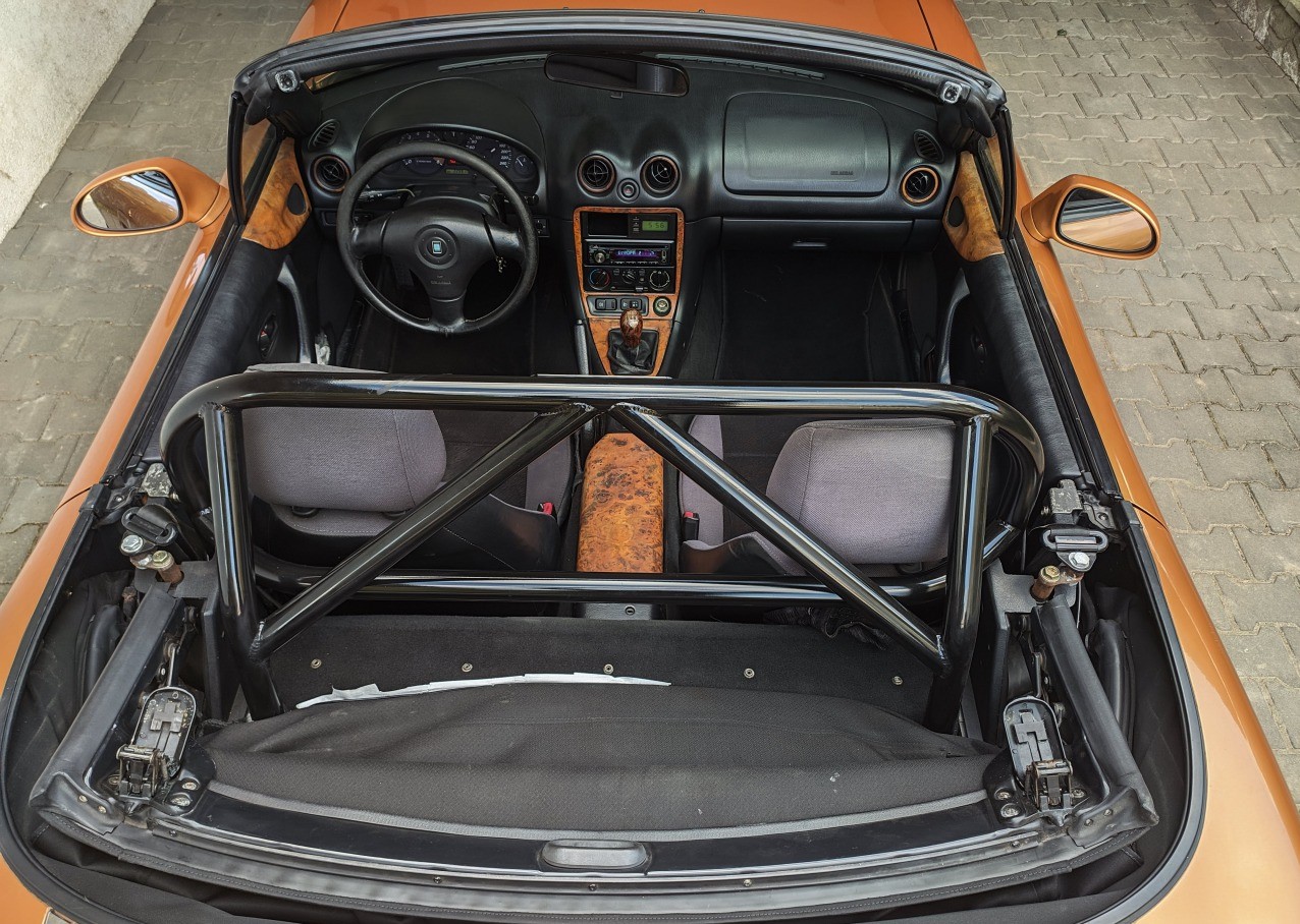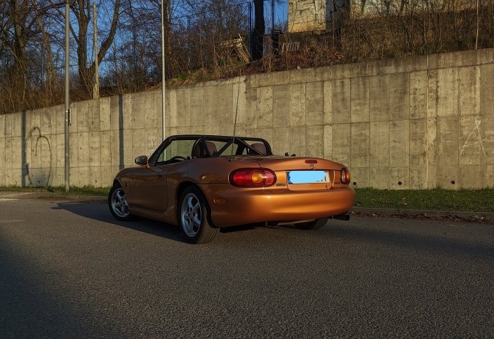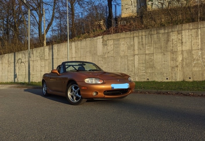 Mazda MX-5 NB 1.6i 81kW. Rok výroby 1998. Najeto 230 xxx km, ABS. El. Ovládání oken a zrcátek. Rádio Pioneer s USB a 3,5mm jackem. Funkční el. výsuvná anténa. Dělené látkové sedačky (řidičova natrhlá viz. Foto), interiér dřevodekor. Originální rozšiřující prahy. V červnu 2020 větší servis. Provedena výměna rozvodů včetně vodní pumpy, přetěsnění gufera vačky a kliky (nová), nové svíčky, nové těsnění víka ventilů. Výměna oleje v motoru, převodovce a diferenciálu, nový filtr oleje. Nové přední brzdové kotouče a desky. Nové zadní stabilizátory. Nová sportovní vložka sání Pipercross. Výměna střechy za pěknou látkovou (prasklý plastový rámeček okolo okna, s páskou nezatéka, vzhlednějším řešením je okno vyměnit za fólii), ošetření střechy produkty značky Renovo (přidám k autu). Na jaře 2021 výměna brzdové a chladící kapaliny. Výměna kol za originální Enkei s pneu Uniroyal Rainsport 3 (hodně vzorku, DOT 15). V autě je ochranný rám (rollbar) značky Sauberer. Horší kosmetika, prasklý (“opravený”) přední nárazník, promáčklé řidičovy dveře a důlek nad pravým zadním kolem. Koroze zadních prahů a nosníků motoru (nevyvařeno). Sluneční clony, originální windschott a původní vinylovou střechu přidám k autu